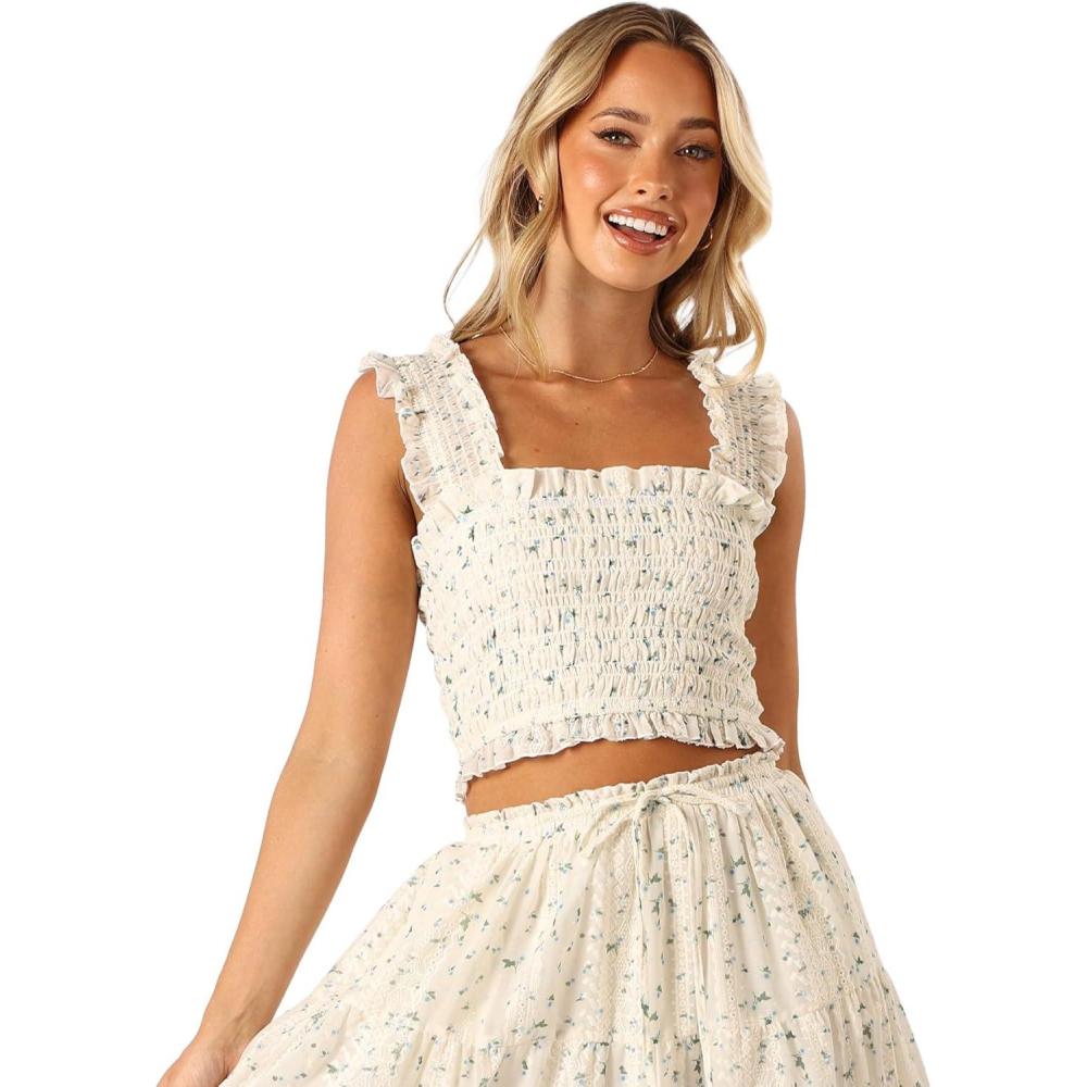 Step into style with the Amberlyn Sleeveless Top in Blue Floral. The cropped length and square neckline offer a modern silhouette, while the elasticized shoulder straps ensure a comfortable fit. The shirred bodice and ruffle detail add a touch of fun, and the floral print is a timeless classic.
