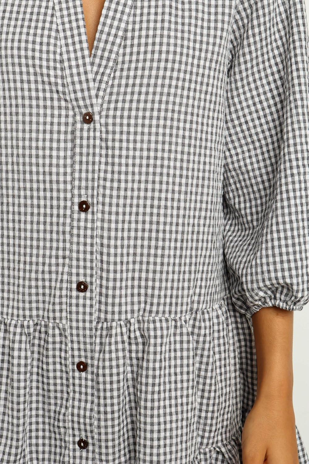 This gorgeous gingham print dress is the perfect addition to your summer wardrobe! Its mini length and oversized relaxed fit make it a comfortable, yet stylish choice. The v neckline gives this dress a fun touch, while the long sleeves with elasticized cuff add an elegant flair.