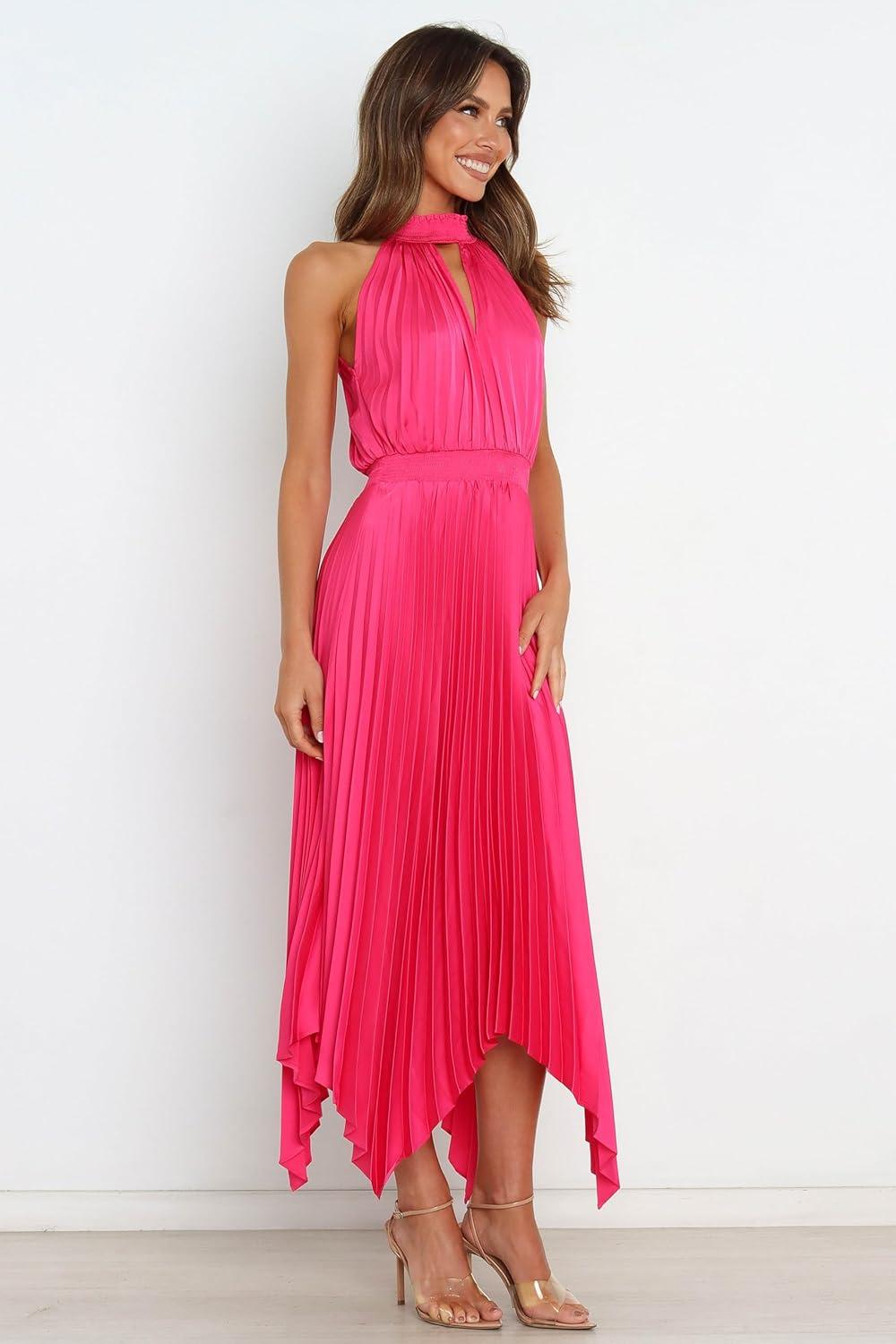 The Dominique is an elegant halter dress with a handkerchief hemline and cut outs for a touch of fun. Shirring creates a stunning silhouette, while the button close front means it's easily worn. Perfect for date night or special events, the fine pleats and satin finish will have you feeling stylish.