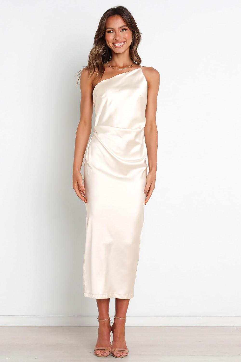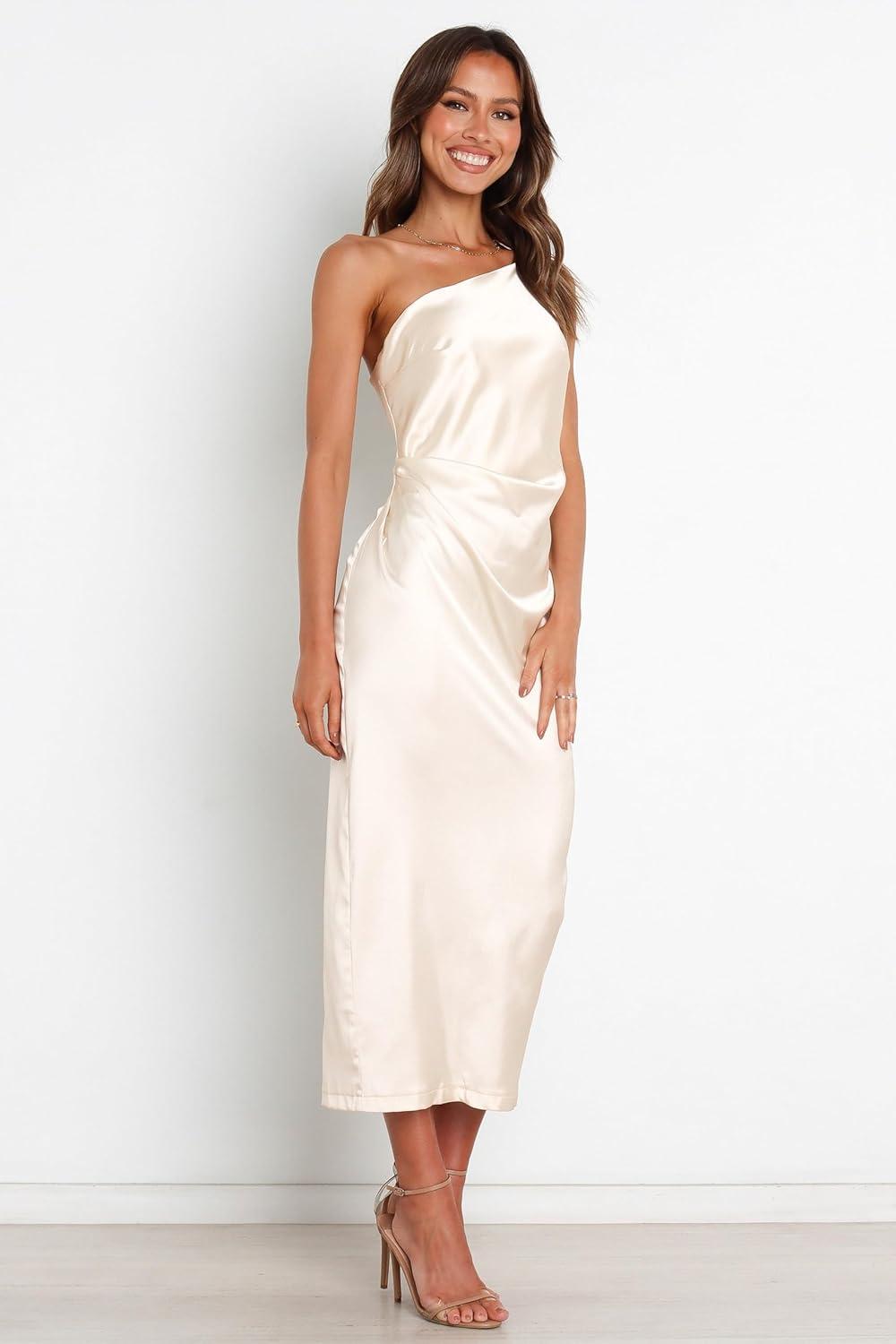 Be the life of the party wearing this one-shoulder maxi dress. The gathered side detail adds a playful look, while the back invisible zip ensures a comfortable fit. You'll be sure to turn heads with its satin feel fabric that provides an elegant touch.
