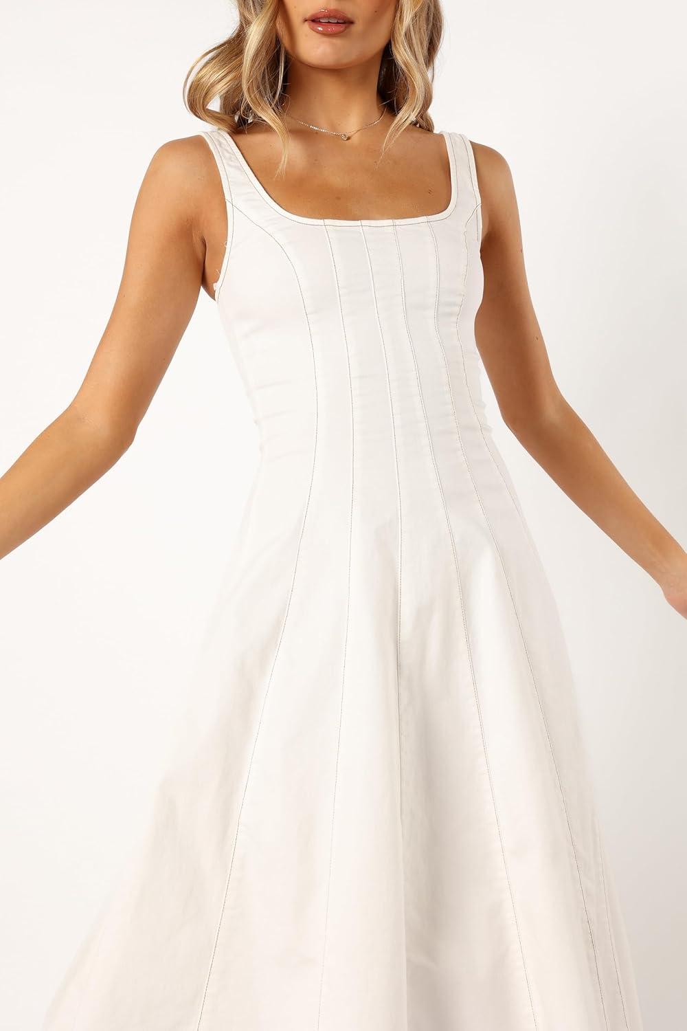 This midi dress is the perfect addition to your spring wardrobe. The classic square neckline, adjustable straps and sleeveless design combine for a stylish yet comfortable look. The contrast stitching detail adds a touch of interest.